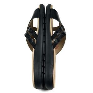 A lightweight sole, padded footbed and gel-heel insert bring supreme comfort to a breezy leather sandal topped with croc-embossed and smooth leather straps. Flat sole Cushioned footbed Leather upper and lining/rubber sole. Made in Brazil
