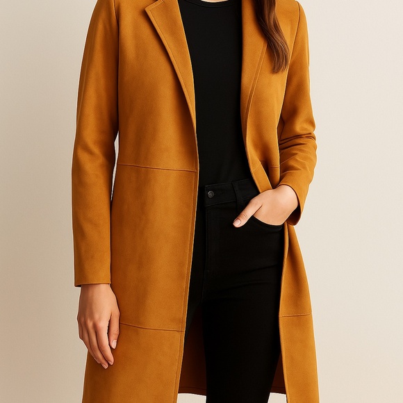 Marc New York by Andrew Marc open-front faux-suede coat in a warm camel color. Minimalist design with a clean collar, soft brushed texture, and long streamlined silhouette. Lightweight, unlined, and easy to layer over both casual and dressed-up looks. Modern, sleek, and versatile.