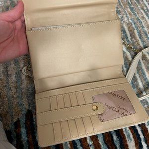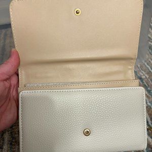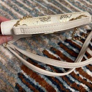 This never used, beautiful white, cream, and gold snake print crossbody is the perfect addition to any outfit. This crossbody features a removal faux leather and gold chain, turning this into a cute clutch. Inside is features 6 card slots, two slip pockets, and a phone slot which are secured by two, separate snap closures.