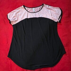Blouse/top — black body with blush yoke, short sleeves, rounded hem.
