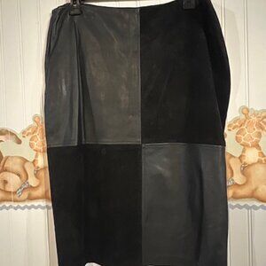 Panel midi skirt — black, mixed textures (suede/leather-look panel) for a sleek, elongated line.