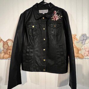 Marc New York • Andrew Marc faux-leather jacket — floral embroidery at chest front and back, matte-gold buttons, classic trucker silhouette.