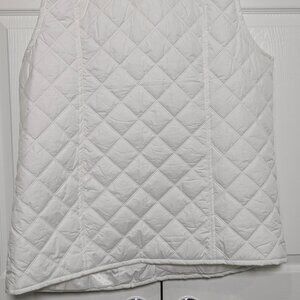 Marc New York | Andrew Marc Women's quilted puffer vest in white, plus size XXL. Features a full zip front, two front zipper pockets, and two snap closures at the neck. Made of 100% polyester, machine washable, and includes original tags in the pocket. Pre-owned with small blemish marks inside the neck (possibly makeup) and a small mark on the bottom, both shown in photos. Measures approximately 25" armpit to armpit, 28" from center back of neck to hem, with an additional 3.5" from the collar.
