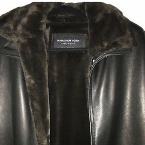 Good preowned condition Marc New York Andrew Marc genuine leather jacket with detachable vest (faux fur), zipper in the front, 2 pockets (zipper). Length of the jacket 33", sleeves 22", shoulder to shoulder 18.5”, armpit to armpit 23”. Has minor imperfection (almost unnoticeable) on one sleeve (see pictures). Let me know if you have questions. Thanks!