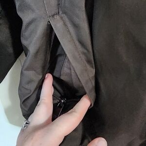 has faux fur sherpa lining along the inside of the collar and down the trim near the zipper.