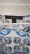 Elegant blouse with intricate blue and black patterns. Features a stylish side tie.