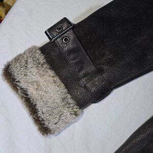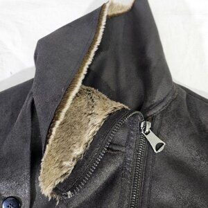 A sophisticated Marc New York coat designed for women who appreciate style and warmth. This Brave Heart coat features a faux-shearling lining for added comfort and a belted waist for a flattering silhouette. The coat's dark color and high collar provide a modern, sleek look suitable for cold weather.