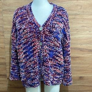 Marc New York L Cardigan Sweater Red White Blue. V neckline with four button closure. Wide cuff sleeves.