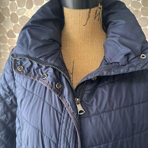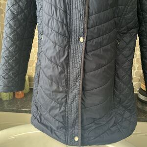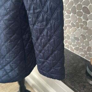 Marc New York Navy quilted jacket with removable hood, zipper and snap closure, two outside and one inside pocket. Length is 29 inches.PTP is 22”– size large