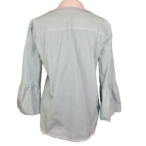 Marc New York green and white, striped, 3/4 sleeve, peasant blouse with pompom detail.