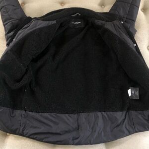 Marc New York black quilted winter coats with faux Sherpa lining and corduroy trim in the zipper placket and under the collar. Deep pockets for your hands that snap closed and two interior pockets for your valuables. Cotton and polyester blend. Laying flat measures 29 inches shoulder to hem and 23 inches armpit to armpit