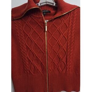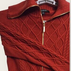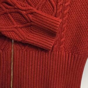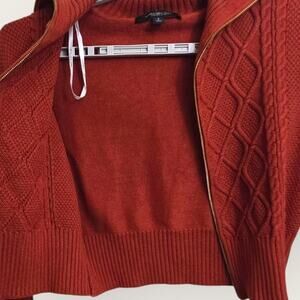 Trendy and cozy Marc New York cropped knit sweater in a bold red color. Features a unique diamond knit pattern, fold-over collar, and front zip with branded pull. A great statement piece that pairs perfectly with high-waisted jeans or skirts.