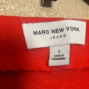 Vibrant red sleeveless top. Open front design. Stylish button accents.