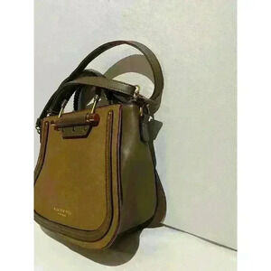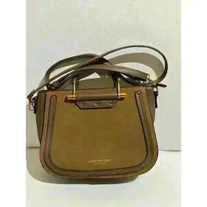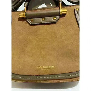 This Marc New York bag is a versatile and stylish choice for any occasion. With a domed shape and tan leather exterior, it features a zip and buckle closure, adjustable strap, and double handles. The bag is medium-sized, with a width of 12 inches, height of 9 inches, and depth of 5 inches.