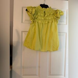 Bright lime/chartreuse green Marc New York top featuring a smocked bodice and layered ruffle flutter sleeves. Lightweight and flowy with a flattering babydoll-style fit. Perfect for spring and summer, brunch, vacations, or casual days.