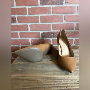 Tan pointed toe block heels size 8.5. Heels feature a metallic detail on the heel and padding inside the shoe. Beautiful heels that can elevate your outfit for a special event.