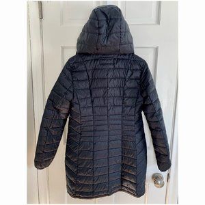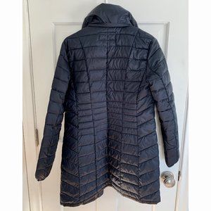 - Navy puffer exterior, black interior