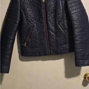 Sleek navy leather jacket. Features quilted design. Ideal for stylish outings.