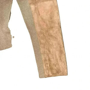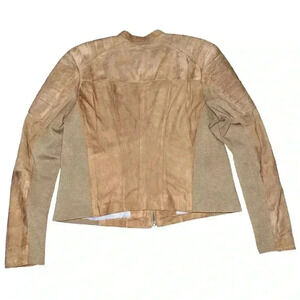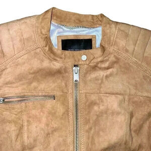 Marc New York leather jacket size xl never worn no tags perfect condition fully lined shoulder 1 chest zip pocket 2 zip hip pockets details with quilted patches 1 interior hidden pocket buckskin color suede see photos for measurements