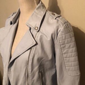 Marc New York of New York faux gray leather crop jacket. Detailed accent on shoulders and lower side faux belt. As symmetric side zipper and side zip pockets. Also silver button trim on collar and down front . Medium. NWOT