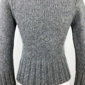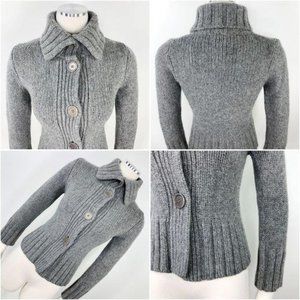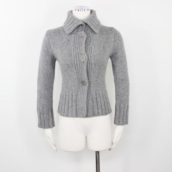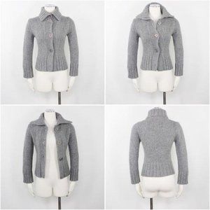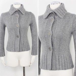 Marc O’Polo Women’s Sweater 100% Merino Wool Grey Chunky Knit Cardigan Button Front Collar Fitted Long Sleeve Pull Over Crew Neck Waist Length Ribbed Hem Italy