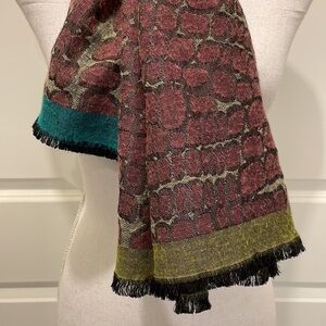 Marc Rozier Paris Print Scarf with Fringe Edges. Teal accent stripe on one end, and a chartreuse accent stripe on the other. Made in France.