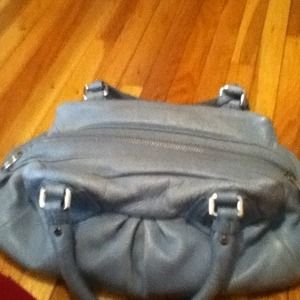 The Baby Aiden handbag by Marc by Marc Jacobs is made of lightly textured leather. It has a beautiful pastel tone of baby blue with an optional adjustable strap attached. The handbag is retailed at $468. In good condition. Needs cleaning & minor wear on handle & on sides. Slight fading from normal wear.This bag still has lots of wear. Well below asking price