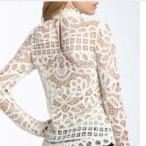 Beautiful romantic top in lace crochet with scalloped edges and interior lining. Stand collar with 2-button keyhole at back and single-button closure at cuffs