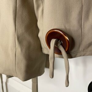 Made from a wool-blend (rayon/wool/elastane) with a snap closure at waist, sewn in fabric tie belt, and large button accent ties on sleeves. Fully lined; sleeves are lined in a satin dot fabric. Hidden front pockets. Short cropped trench coat style.