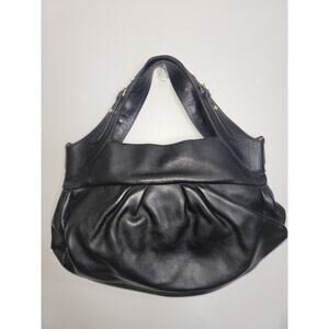 Preloved It is a black leather bag with a slouchy hobo style and a gold-toned logo plaque on the front. The bag has a single rolled handle and can be worn on the shoulder. It also features triple pleats below the logo.