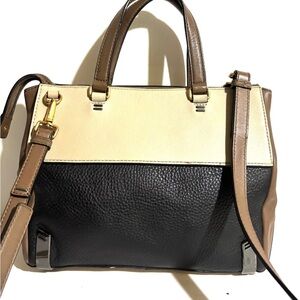 This elegant handbag features a sophisticated black and cream design, perfect for any occasion. Its stylish look is complemented by high-quality materials, making it a must-have accessory. Main compartment 3 pockets at interior wall 1 zip closure logo at front lining have some stains exterior have marks stains the zipper is a little sticky opening and closing it needs to be fixed hight 10” Wide 12” depth 4.5” strap drop 6” shoulder strap 21” adjustable