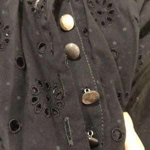 Excellent condition no stains rips or fading. A-line silhouette, knee length skirt that sits at the natural waist. Buttons in back. Black with eyelet cotton shell and black and white polka dot lining that shows through the eyelet cut outs. Very cute and unique style.
