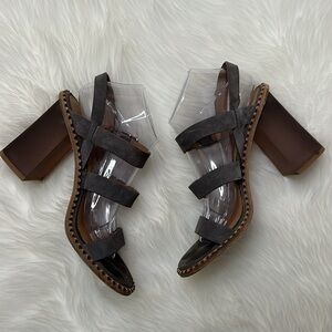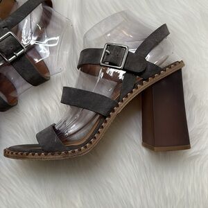 Marc by Marc Jacobs grey suede sandals. Chunky heel made of semi transparent lucite. Buckle strap. Womens size 40EU/10US. Great used condition.