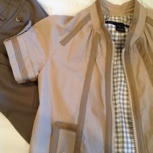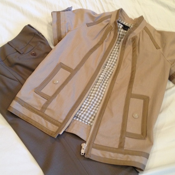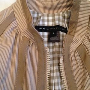Cute Tan pin stripe jacket. Great structured shape, fully lined with contrast plaid. Short sleeves. Zip front. Front pockets. Size 2. Marc by Marc Jacobs. I've worn this a couple of times but it looks brand new. Very sassy and classy