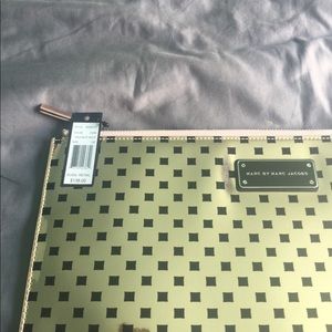 14x10.5". Reflective rose gold with black squares. Zippered closure. Brand new with tags.