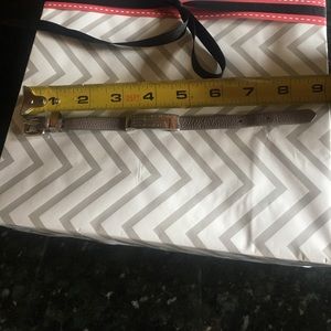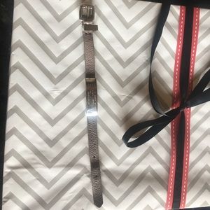 Knotty leather tunnels through an etched logo plate with designer credentials, which lends a touch of preppy-chic to a Marc by Marc Jacobs bracelet.