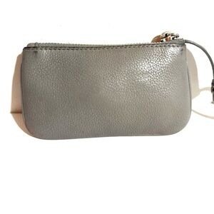 Chic gray wristlet with embossed logo plaque. Features a convenient fabric lining minor stains fading hight 3” width 5.5” depth 0.5”The dimensions are based on approximately measurements before placing an order please check take a moment to view all photos using feature for a closer look