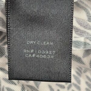 Draped sides, Elastic waistline, V neck; square back, Surplice Bodice, Knee-length; sleeveless. Slouch pockets on both sides of skirt section. Black on white. Approximate measurements: 15" pit to pit, 12" elastic waist, 42" length.