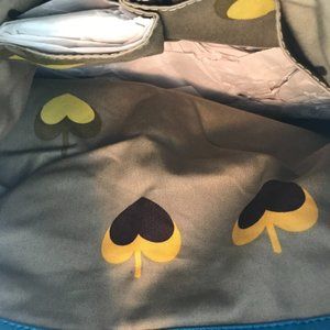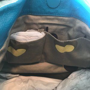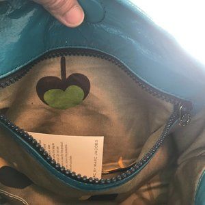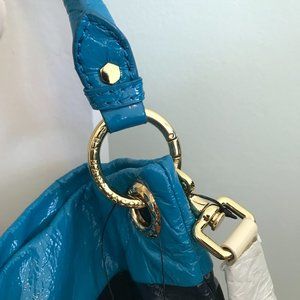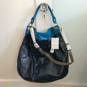 Carry all of your essentials in this soft, slouchy leather hobo from Marc by Marc Jacobs. This classic Q Hillier bag features a single rolled handle and a removable and adjustable shoulder strap. Crafted in patent leather in two contrasting shades of blue, it is accented with signature triple pleats below the workwear-inspired logo plate. Its fabric lined interior has one zipped pocket and a patch pocket. Original protective packaging still on parts of handbag.