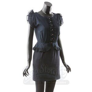 Marc by Marc Jacobs Navy Ruffle Dress as seen on Alice Cullen in The Twilight Saga Breaking Dawn Part I (2011). It was once thought to be custom made, but it's actually this dress with alterations to the neckline. Removing the ruffles gave the dress a much cleaner, cuter look. The image watermarked Prop Store is a photo of the screen worn dress for comparison. The dress being sold is screen accurate, not screen worn.