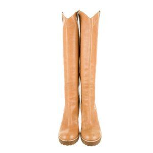 Authentic Marc by Marc Jacobs Vintage tall leather boots in a rich, warm tan—Rare and no longer produced. These Y2K-era knee boots feature soft pebbled leather, a flattering almond round toe, and chunky block heels with a grippy lug sole and 1-inch platform. Western-inspired shaft cut and contrast stitching elevate the silhouette.