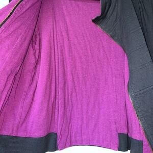 Marc By Marc Jacobs Ruffled Knit Zip Jacket navy with purple interior. Size Large Approx 17” armpit to armpit flat; approx 22” shoulder to hem. Fits more like a Medium. Small pin hole on inside ruffle towards the hem - see photo.