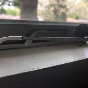 Aviator style glasses with clean white detailing. Polarized. Brand name on the sides. Comes with case and microfiber cleaning cloth (used once) original to sunglasses. 5th picture included to show how dark they are. Pictures included to try to show what they look like on the face.