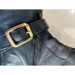 your style game with these sleek knee-high boots from Marc by Marc Jacobs. Crafted from genuine leather, these round-toe riding boots feature a low heel and a pull-on closure for easy wear. The black shade gives them a classic touch, while the buckle detail adds a stylish element to your outfit. These boots are perfect for the fall and winter seasons and are ideal for any motorcycle-themed occasion. The boots have a medium width and are available in size 37.5 (US 7).
