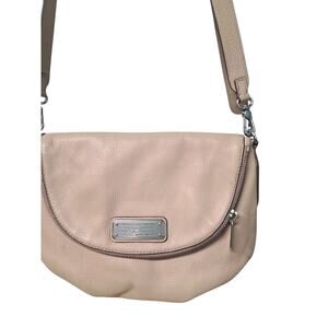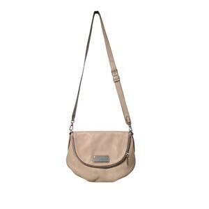 Description: Marc by Marc Jacobs Tan New Q Natasha Leather Crossbody Bag, gently used condition. Features leather exterior with cotton fabric lining, detachable adjustable shoulder strap, flap top with button closure, exterior zipper pocket, interior slit and zipper pockets, silver hardware, discontinued style in hard-to-find tan color, rare find, style No. M0005339, made from Italian bovine leather, perfect for stylish everyday carry. Smoke-free home, fast shipping, bundle to save!