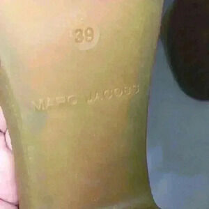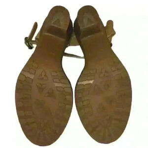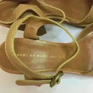 Super cute and comfortable Marc by Marc Jacobs Tan Leather Sandals w/ Rubber Platform Heel. Adjustable ankle strap w/ brushed gold circle buckle that has Marc Jacobs imprint. Leather upper is a light to medium tan soft pebbled leather with topstitching detail. Matching tan pebbled leather insole approx 10.25". Crepe rubber heel approx 4.5" w/ .75" platform & lug soles.