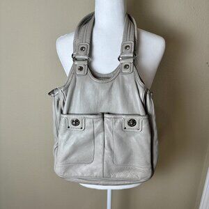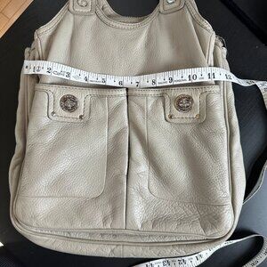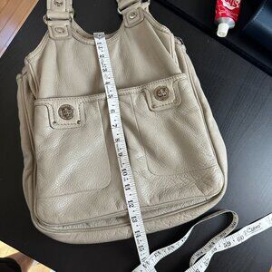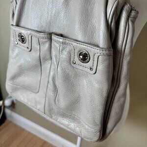 Marc by Marc Jacobs "Totally Turnlock Teri" bag in a soft grey/taupe color with silver hardware classic shoulder bag has 3 interior areas plus 2 exterior pockets..hardware is silver, bag is sturdy and well made, buttery thick leather. Some signs of light wear--please see pics.