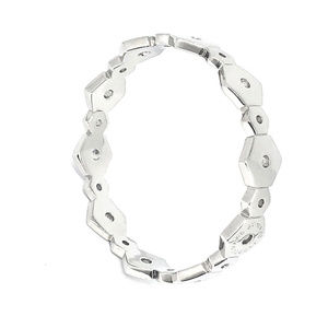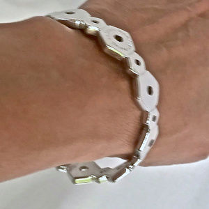 Never worn. Will come in original pouch. Circumference is approximately 7", .70" wide and weighty. I believe the base metal is brass. Perfect stand alone or layering piece. Sold out. I spent hours unsuccessfully looking for another one. It's a tad too big for my 6" wrist. Minute signs of wear from storage and handling. NO OFFERS.