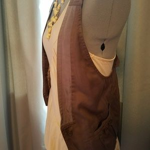 Neutral brown utility vest, lined with pin stripe detailing. Functioning buttons. Tailored yet relaxed look. Dress up or down.