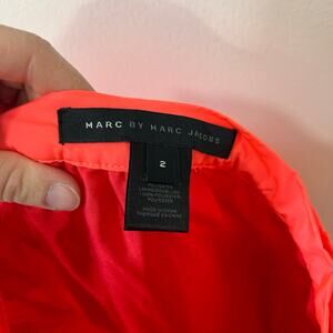 Marc by Marc Jacobs Women Size 2 Ellsworth Draped Taffeta Pencil Lava Pink Skirt. The shell and lining are 100% polyester. The waist measures 25 inches and the length from waist to hem is 22.5 inches. In excellent condition. The picture is slightly brighter than in person.